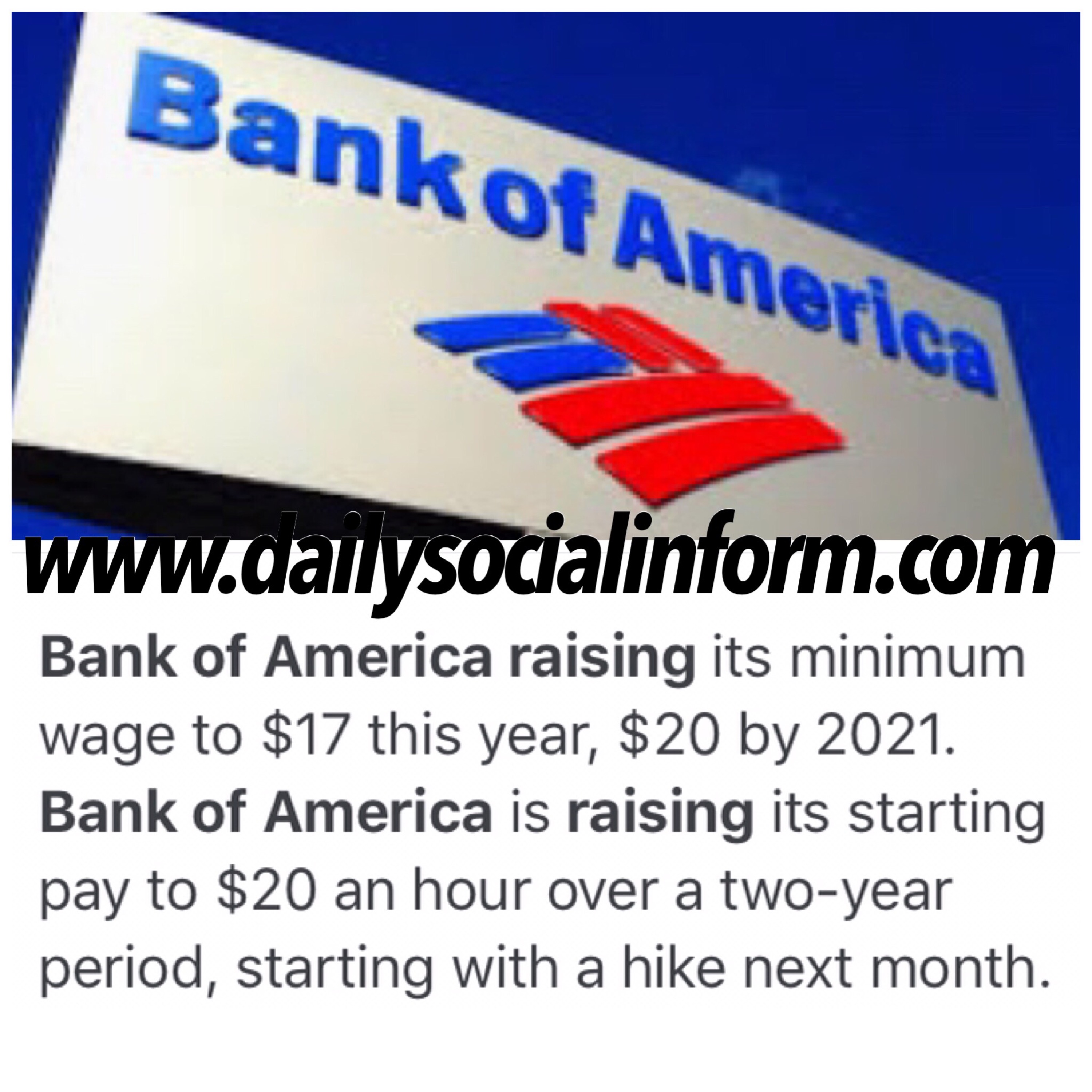 Way to go Bank of America! ☝️🤑 Minimum wages going up to $17 a hr this year 2019 and up to $20 a hr by 2021. 💰 #dailysocialinform #money #banks #employees #work #jobs #bankofamerica #appreciateyouremployees
